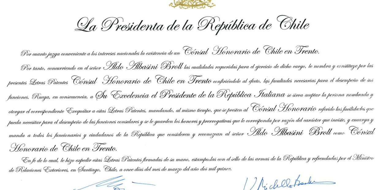 Nel 2015 è nominato Console Onorario della Repubblica del Cile nella Regione Trentino Alto Adige/ Südtirol e nel 2016 è eletto Rappresentante nella Regione Trentino Alto Adige/Südtirol del Gruppo Consolare dell’America Latina e dei Caraibi nel Nord Italia.